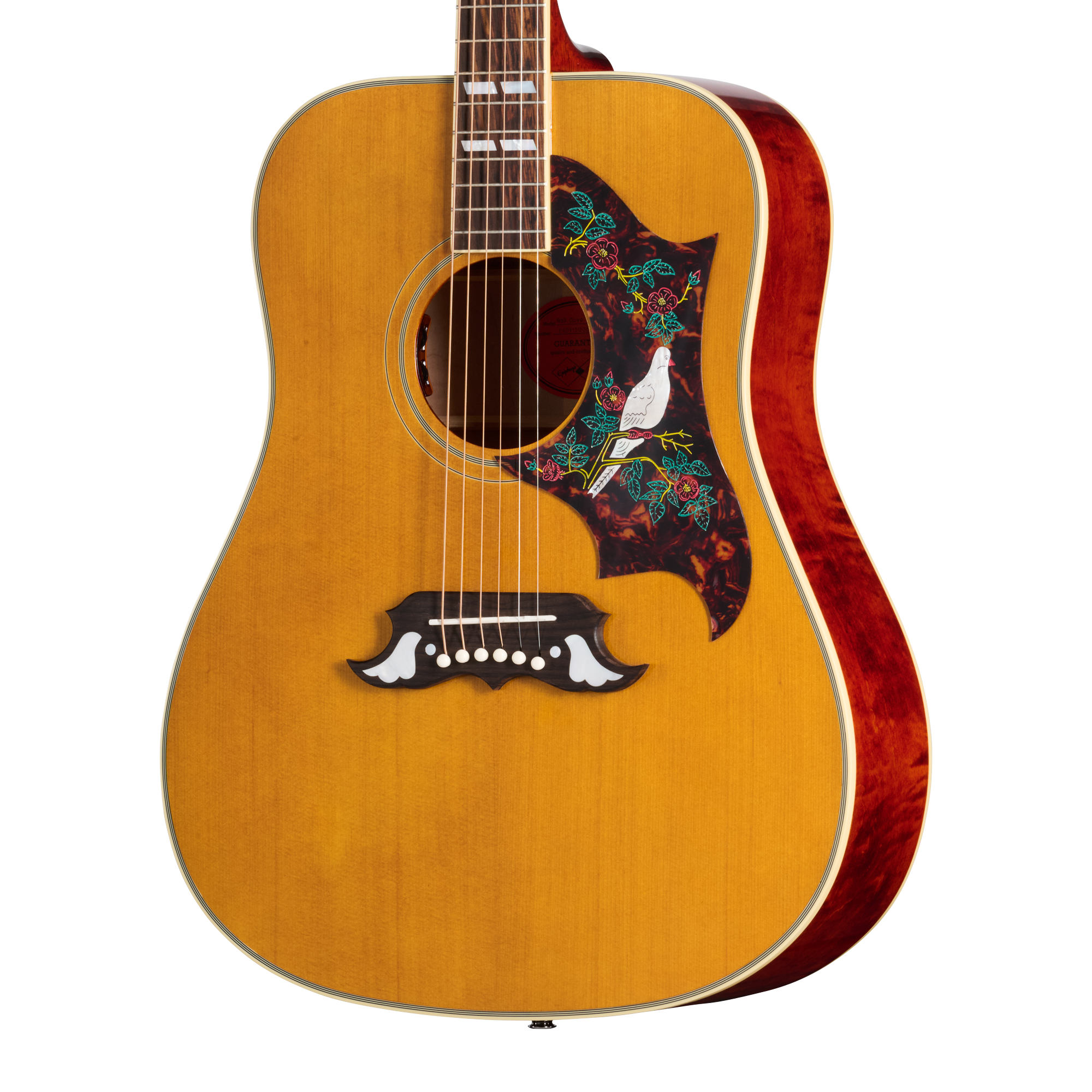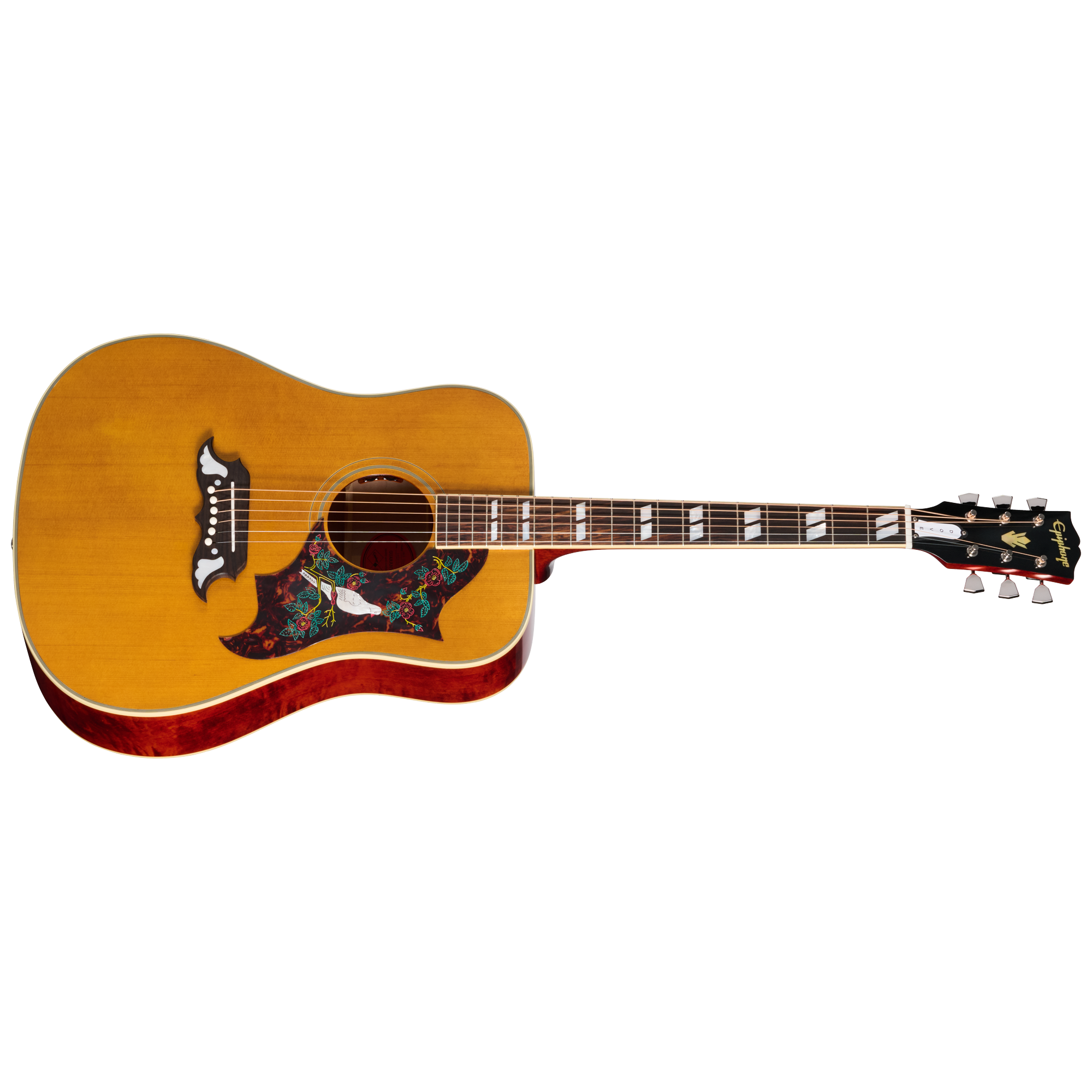 ヘッドストックについて、Kluson®のワッフルバック・チューナー(メタル製キーストーンボタン付き)を装備し、安定したチューニングを実現しています。ヘッドストックには2層のトラスロッドカバーが取り付けられ、「DOVE」の刻印が施されています。Epiphoneロゴとギブソンのクラウンインレイはエイジド・マザー・オブ・パールであしらわれています。ヘッドストック形状はギブソンと同様の“オープンブック”スタイルで、裏面にはInspired by Gibson Customのダブル・ダイヤモンド・ロゴが刻まれています。