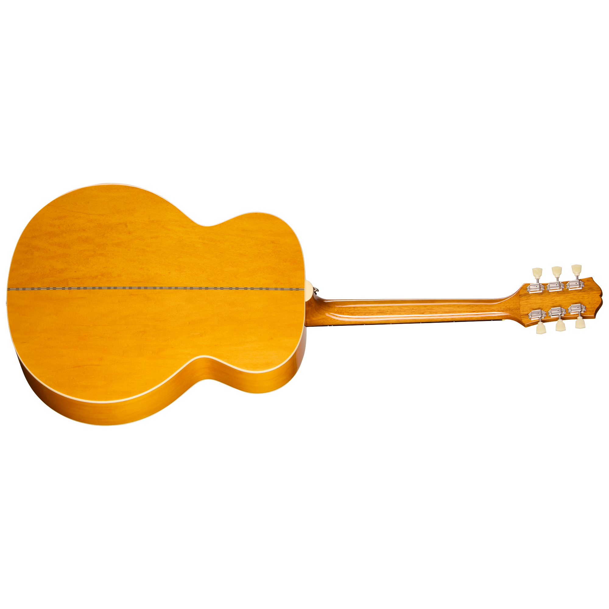 J-200 スタジオは合板メイプルボディを採用。表板には4層のバインディング、裏板/指板/ヘッドストックには1層のバインディングが施され、表板には単板スプルースを使用。反応が良くバランスの取れたトーンと優れたダイナミックレンジを実現し、経年とともに音色の向上をお楽しみいただけます。マホガニーネックはテーパー加工されたダブテイルジョイントでボディに接合され、快適なプレイアビリティを保証する1960s スリムテイパー D プロファイルを採用。ローズウッド指板には20本のフレットが打たれ、パーロイドによるクラウン・インレイが施されています。プラスティック製のコンペンセイテッド・サドルは、黒いドット付きでアイボリー色のブリッジピンとともに、ローズウッド製のマスターシュ・ブリッジ上にセットされています。象徴的なマスターシュ・ブリッジ上では、パーロイドによる4個のインレイが飾られています。さらに、ヴィンテージスタイルのデザインによる視覚的魅力を高めるべくこだわりの仕様を採用。伝統的な2色構成でのJ-200グラフィックが描かれたトータスシェル柄のJ-200ピックガード、キーストンボタン付きのエピフォン・デラックス・チューナー、そして60年代カラマズースタイルのバインディング付きヘッドストックとマザーオブパールによるエピフォン・ロゴとギブソンのクラウン・インレイ等、ギブソンファン垂涎の仕様内容を誇ります。