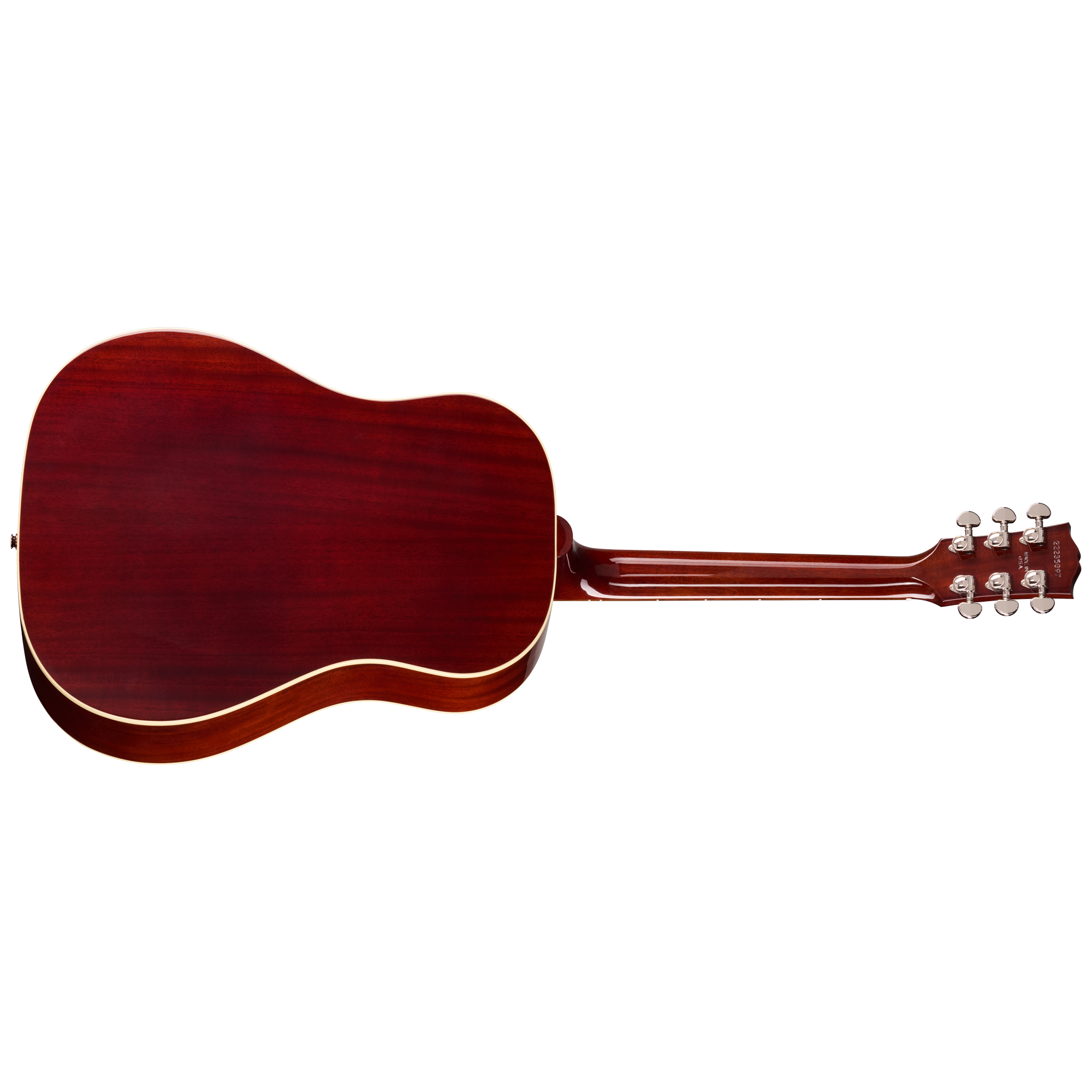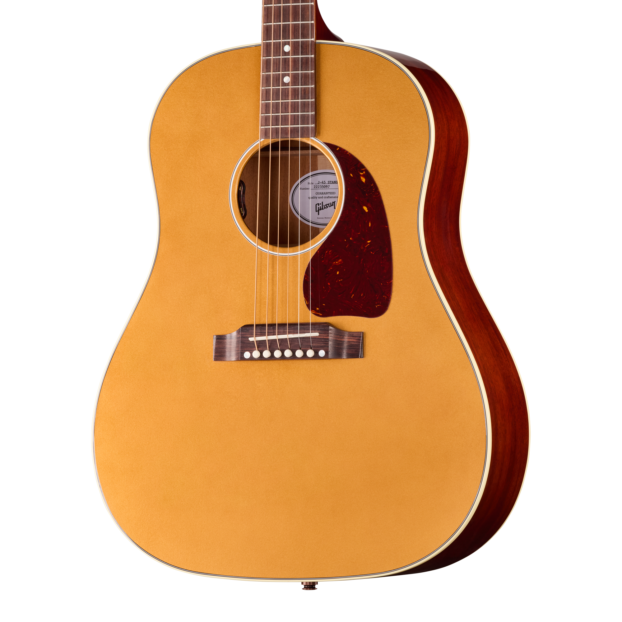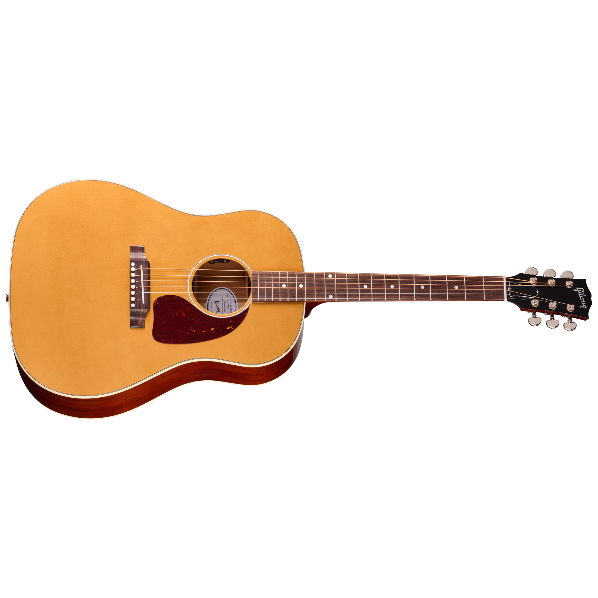 J-45 Standardは、サイド&バックにソリッド・マホガニー、トップにソリッド・シトカ・スプルースを採用したラウンドショルダー・ドレッドノート・ボディを特徴としています。トップにはマルチプライ・バインディング、バックにはシングルプライ・バインディングが施されています。マホガニー・ネックには、素早く快適な運指を可能にするスリムテーパー・プロファイルを採用。優れたトーンの伝達とサステインを実現するため、コンパウンド・ダブテイル・ネック・ジョイントによってボディに固定されています。指板には20本の標準フレットを備えたローズウッドを採用し、シンプルなマザー・オブ・パールのドット・インレイが施されています。ヘッドストックにはマザー・オブ・パールによるギブソン・ロゴが輝き、高品質なGrover® Rotomatic®チューナーを装備。TUSQ®ナットとの組み合わせにより、スムーズで信頼性の高いチューニングと優れた安定性を約束します。