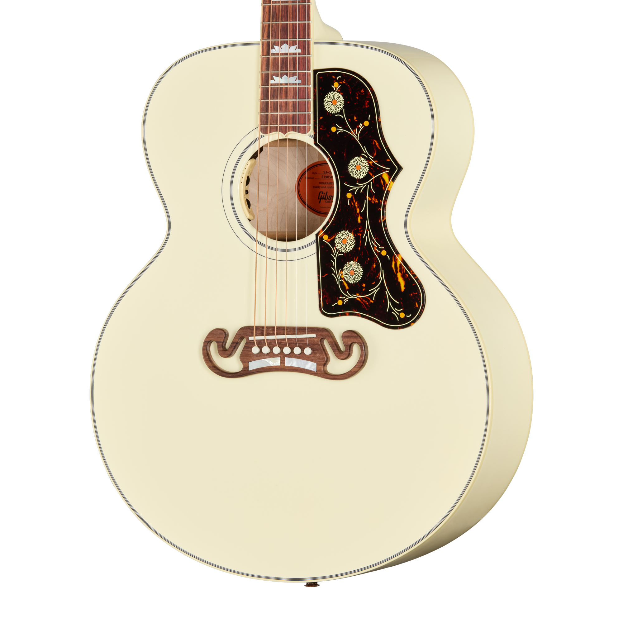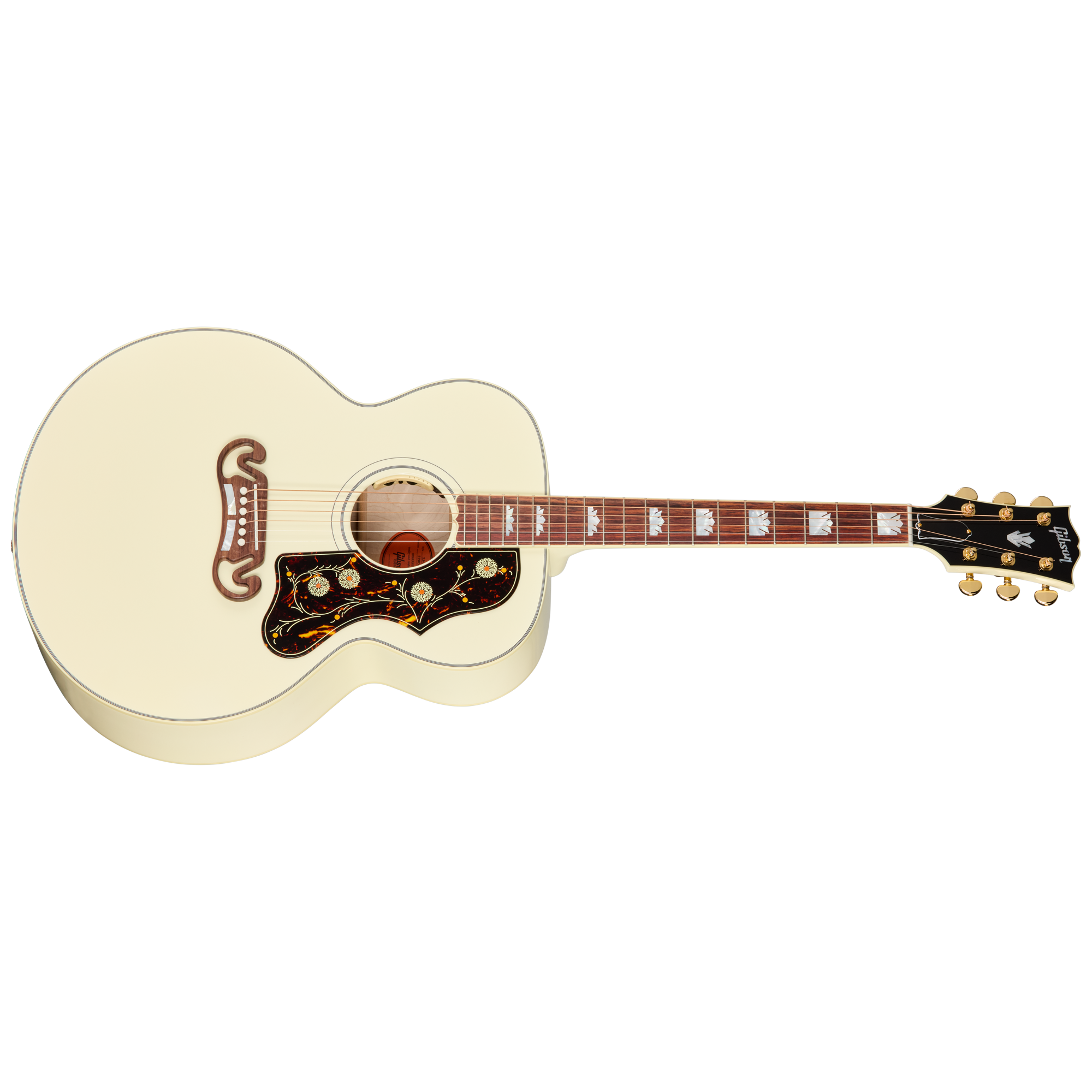 バインディング仕様のヘッドストックには、マザー・オブ・パール・インレイによるギブソン・ロゴとクラウンの装飾が施されています。高品質なゴールドのGrover® Rotomaticチューナーは、TUSQ®ナットと相まってスムーズで安定したチューニングを約束します。ボディには、一目でそれと分かるSJ-200特有のピックガードと、ローズウッド製の2バー・マスタッシュ™・ブリッジを装備。サドルとブリッジピンにもTUSQを採用しています。