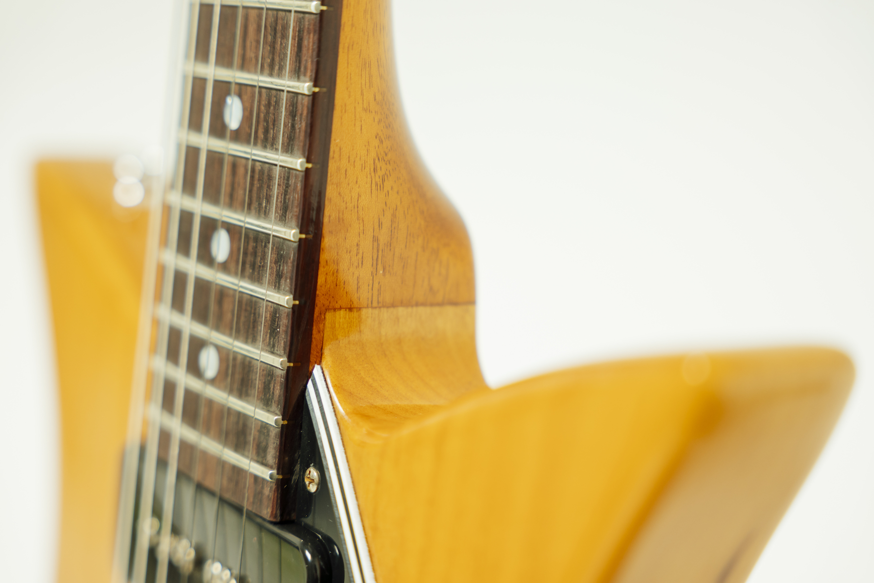まるで倉庫の片隅から発見されたような少し艶を抑えたV.O.S.フィニッシュが施されたカラーはナチュラル、チェリー、エボニーの3バリエーション。トータルで318本が製作される。ギターにはオリジナルの認定書に加えて、このモデルの背景を紡ぐために、当時のギブソン・カタログに掲載されたフライング Vの反対側のページを模して作られたセオドアのバーチャル復刻カタログが付属する。1958年に発売されたフライング V、エクスプローラーと全く同じデザインで作られた専用レプリカ・ケースに収められた姿は、パラレル・ワールドで製作されたギブソン・ギターを想起させている。