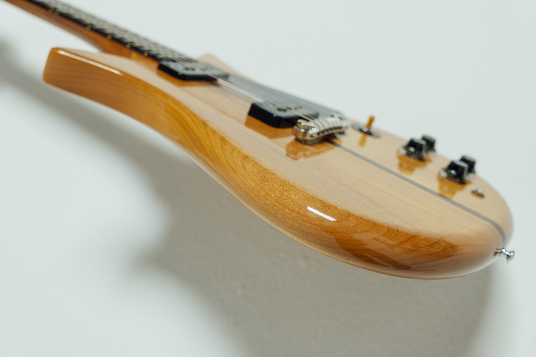 ギブソン・アーカイブ・コレクションの第一弾となる「セオドア」は、テッドのスケッチを反映したデザインを基にカスタムショップのエンジニアリング・チームによってギターとしての整合性や実用性が確保され、さらに当時のギブソン・ギターに見られるスペックや特徴を反映させたものになっている。エクスプローラー型のヘッドストックを持つネックはローズウッド/マホガニー製で、ブラックに仕上げられたヘッドストック・フェイスにはパール・ロゴが入ったホリーウッド・プレートが取り付けられ、ファットな57年タイプのチャンキー・C グリップへと加工されている。深いダブル・カッタウェイ・シェイプの1 1/2インチ厚フラット・ボディは、センター部分にウォルナット・ストリップが挟み込まれたアルダーというテッド・メモを反映した唯一無比のもの。滑らかな弾き心地を実現するために「可能な限り大きな半径の丸みを」という指定に基づいて右肘の当たるエッジからサイド部分は滑らかな曲面で繋がれている一方で、深いカッタウェイや鋭いホーン部分を含めた他の部分はエッジを尖らせるといった手作業ならではの複雑な形状に仕上げられている。外周全体を丸く加工したデザインは、その後のダブル・カッタウェイのレスポール・ジュニア/スペシャル、そしてエピフォン・ソリッド・ギターへと受け継がれてゆくことになる。P-90ピックアップを含めたエレクトロニクスは当時のレスポール・スペシャルと共通のものが組み込まれていて、セレクタ位置、そしてピックガード形状にはギターとしての実用性と当時のギブソンに則したアレンジが加えられている。