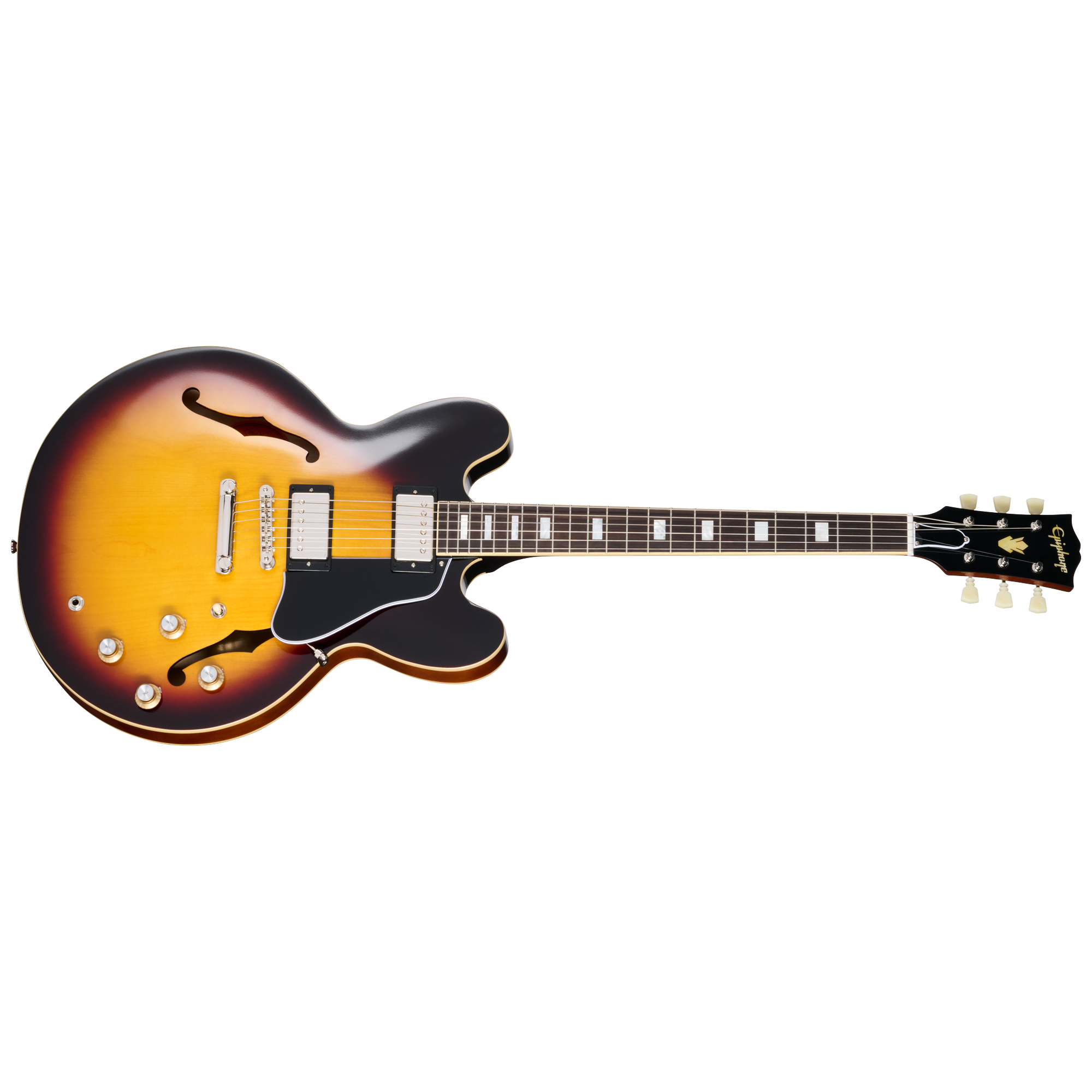 ヘッドストックにはGibsonスタイルの“オープンブック”デザインを採用し、EpiphoneロゴとGibsonクラウン・インレイをエイジド・マザー・オブ・パールで装飾。チューナーにはEpiphone Deluxeチューナー(ダブルリング・キーストーン・ボタン付き)を搭載し、Graph Tech®ナットとともにスムーズなチューニングを実現します。ブリッジにはABR-1 Tune-O-Matic™、テールピースにはGibsonヒストリック・リイシュー・アルミニウム・ストップ・バーを採用し、ソリッド・メイプル・センターブロックに直接弦振動を伝えることで、優れたサステインを提供します。