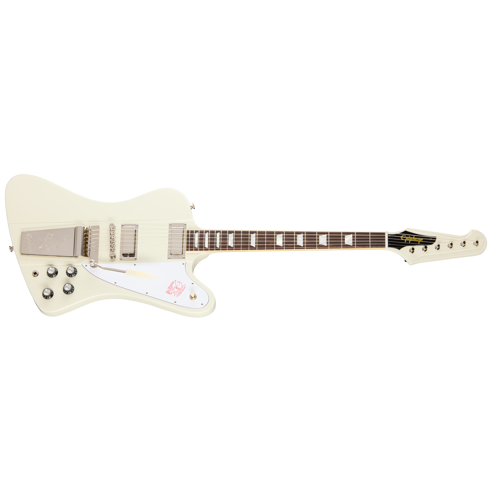 ローズウッド指板には、マザー・オブ・パールのトラペゾイド・インレイが施され、22本のミディアム・ジャンボ・フレットを備えています。サイド・ドットのポジション・マーカーも、ヴィンテージのFirebirdと同じサイズ・配置を忠実に再現しています。ヘッドストックには、Kluson®製のプラネタリー「バンジョー」チューナーを搭載し、クラシックなFirebirdのルックスを再現。Epiphone ABR-1、Epiphoneのロゴが刻印されたMaestro™ Vibrola™を採用し、ヴィンテージ感溢れるルックスと確かな演奏性を実現しています。