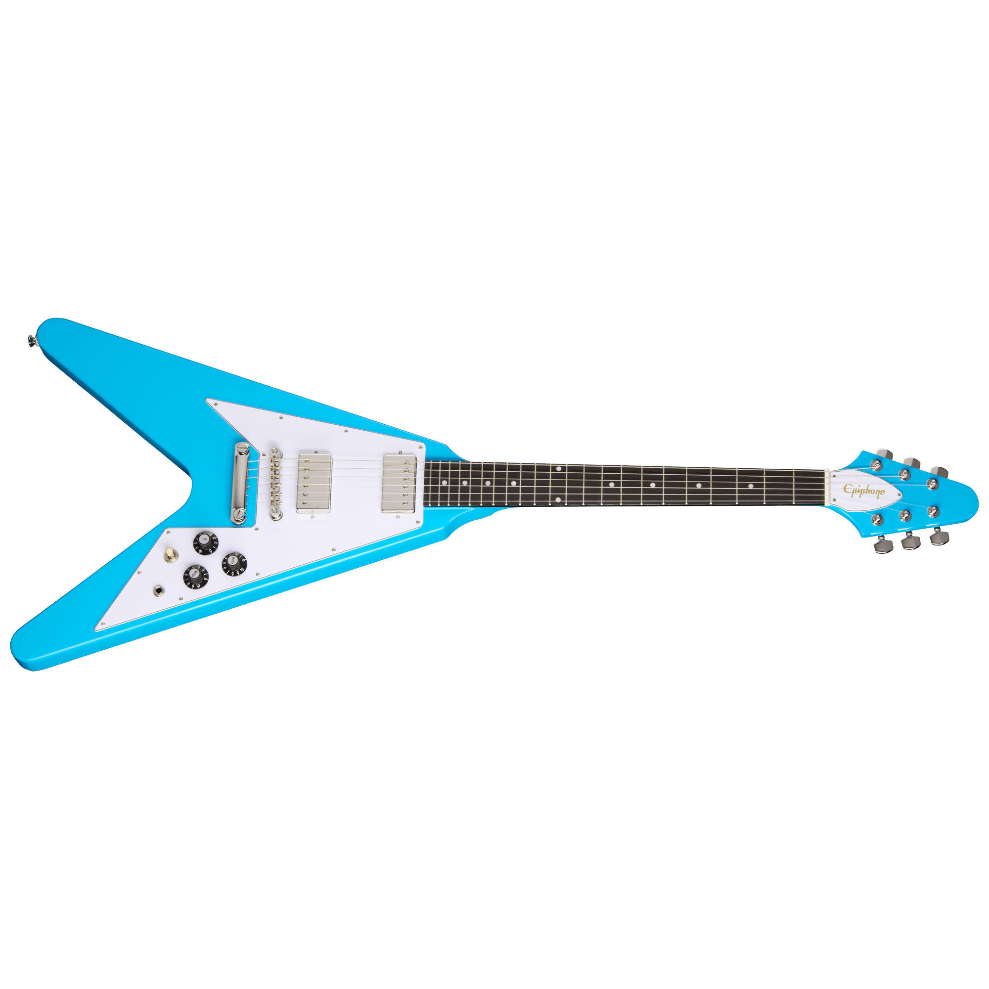 Epiphone Inspired by Gibson Flying V 70sは、音楽史を変えた1970年代のアイコニックなモデルをベースにしています。 Flying V 70sは、センター・シームを備えた2ピース構造のマホガニー・ボディを採用し、強烈な存在感を放ちます。マホガニー・ネックは、演奏性に優れたラウンドCプロファイルを採用し、70年代のヴィンテージ・モデルと同様に、ネックとヘッドストックの接合部にはボリュートを備えています。ローズウッド指板には22本のミディアム・ジャンボ・フレットと、シンプルなパーロイド・ドット・インレイを採用しています。 やや短めの70年代仕様アローヘッド・シェイプのヘッドストックには、スペード・ボタン付きGrover® Rotomatic®チューナーとGraph Tech®ナットを装備し、安定したチューニング性能を実現しています。弦はEpiphone LockTone™ Tune-O-Matic™ブリッジを通り、LockToneストップ・バー・テイルピースに固定されます。 アイコニックなシェイプのマホガニー・ボディには、エピフォンの新開発T-Type PRO™ハムバッカー・ピックアップを搭載しています。これらのピックアップは、当時多くのプレイヤーに支持されたFlying Vならではの太く存在感のあるサウンドと、豊かなサステインを忠実に再現します。コントロールは各ピックアップのボリュームとマスター・トーンで構成され、ウィッチハット・ノブを採用しています。 そのほかにも、70sスタイルのFlying Vピックガードや、エピフォンのロゴがホットスタンプされた70sスタイルのトラスロッド・カバーなど、時代考証に基づいたディテールが随所に盛り込まれています。目を引くグロス・フィニッシュと、無視できないスタイルとサウンドを備えたFlying V 70sは、まさにロックするための一本です。レトロフューチャーなギターに魅力を感じるプレイヤーにとって、コレクションに加えるべきモデルと言えるでしょう。プレミアム・ギグバッグが付属します。