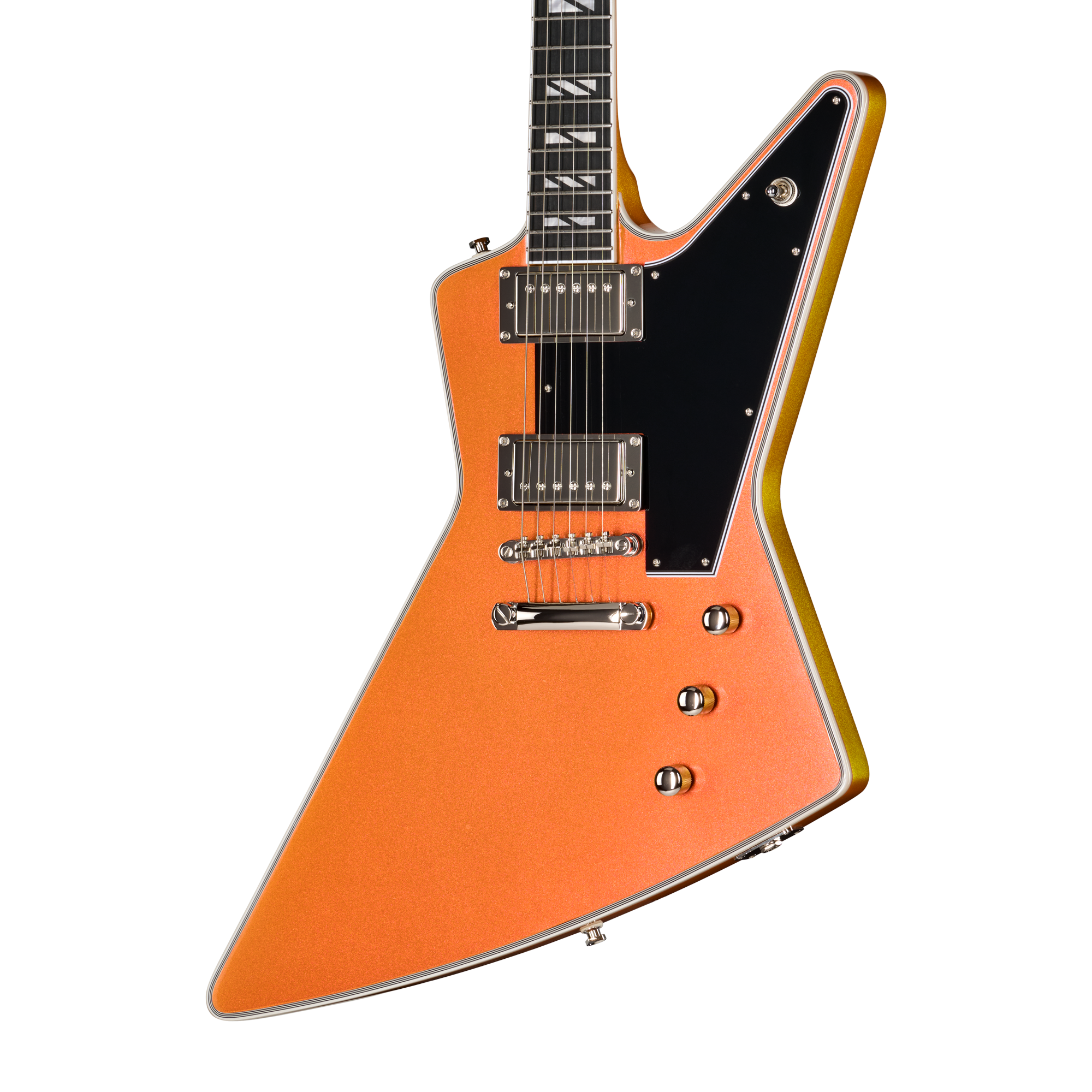 Futura Explorer Customのエレクトロニクスには、エピフォンの新しいProBucker™ Igniteハムバッカー™を搭載し、明瞭さと解像度を保ちながらパワフルなトーンを放ちます。プッシュ/プル・コントロールにより、コイルタップとフェイズの切り替えが可能で、幅広いサウンドバリエーションを実現します。ステージや画面上で目を引く2種類の見事なクロマシフト・フィニッシュ(ファイアストーム・シフト、ドラゴンフライ・シフト)をラインナップ。モダンな美学、汎用性の高い電子回路、あるいはパフォーマンスに応える楽器を求めるプレイヤーに、Futura Explorer Customは応えます。プレミアム・ギグバッグが付属します。