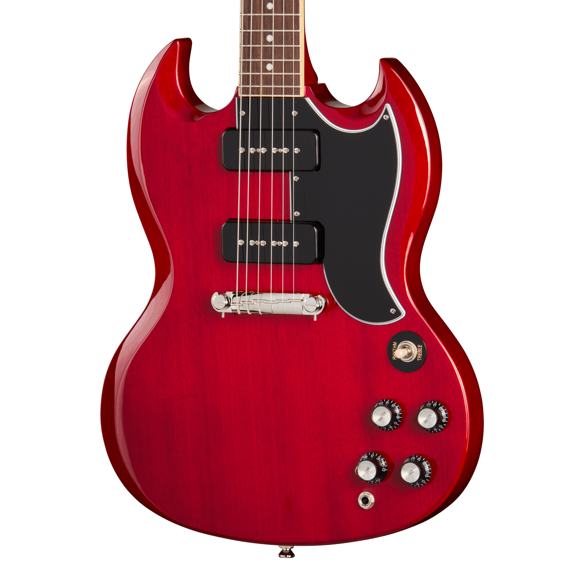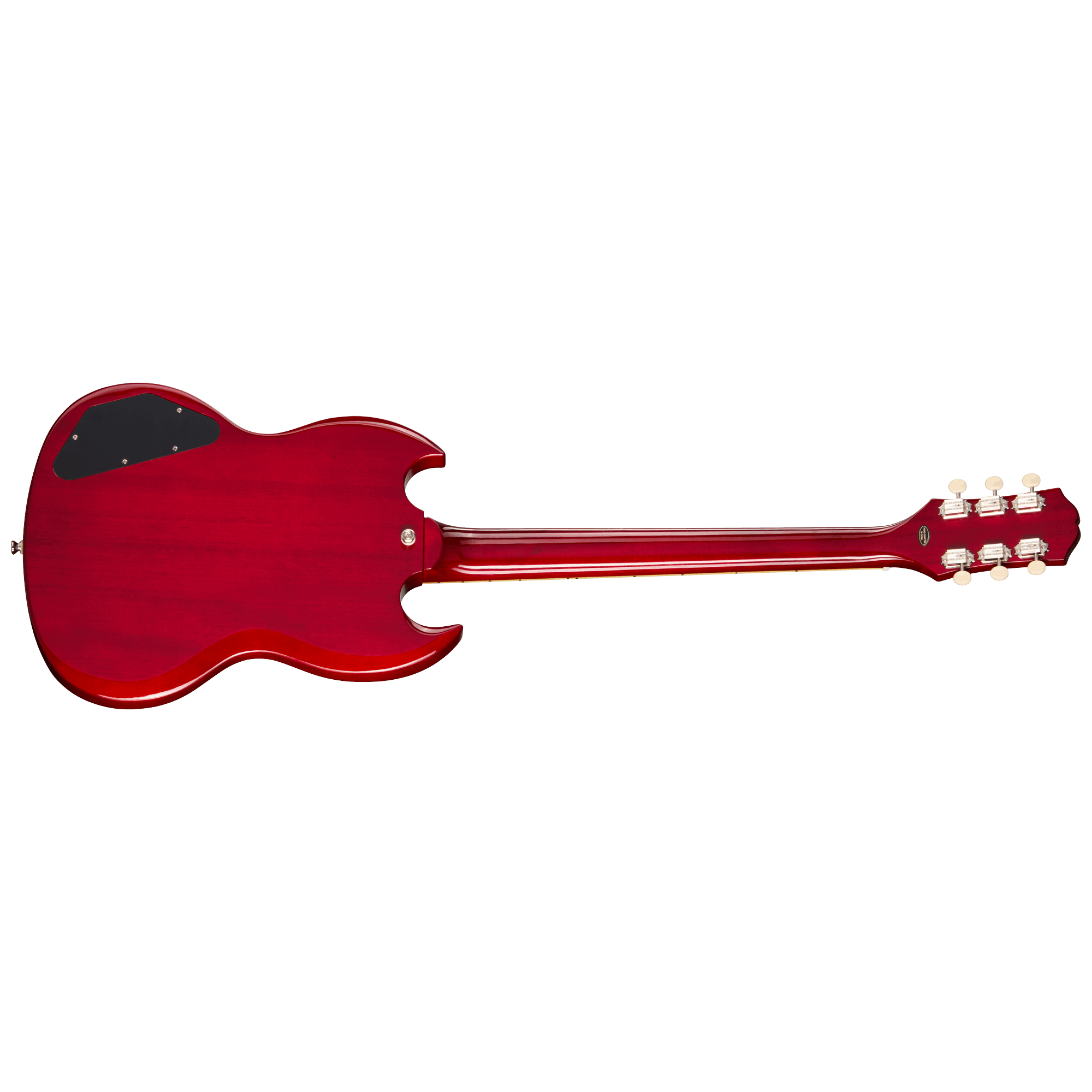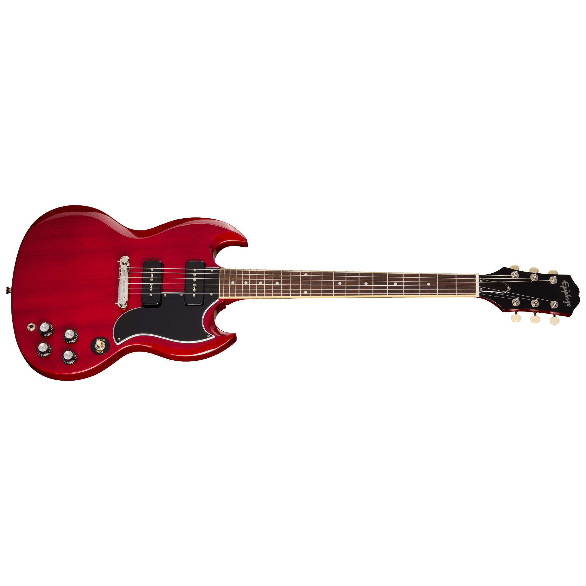 Epiphone Inspired by Gibsonコレクションのアップデート・モデルとして登場するSG Special P-90は、ダブル・カッタウェイのマホガニー・ボディを採用した、伝説的なSGソリッドボディ・エレクトリック・ギターです。マホガニー・ネックには、素早い演奏性を実現する60s スリムテーパー™プロファイルを採用しています。指板にはバインディング付きローズウッドを使用し、22本のミディアム・ジャンボ・フレットとパーロイド・ドット・ポジション・マーカー・インレイを装備しています。 60sスタイルのカラマズー・ヘッドストックには、アイボリー・ボタン付きのエピフォンDeluxeチューナー、Graph Tech™ナットを搭載し、マザー・オブ・パールのエピフォン・ロゴがインレイされています。ブリッジには、SG Specialのヴィンテージなルーツに忠実なコンペンセイテッド・ラップアラウンド・ブリッジを採用し、安定したイントネーションと優れたサステインを実現しています。 ピックアップには、荒々しいミッドレンジのパンチと優れたダイナミック・レスポンスで知られる、エピフォンP-90 PRO™ソープバー・ピックアップを2基搭載しています。ボリュームを絞ればきらびやかなクリーン・トーンを、ゲインを上げれば密度の高いミックスの中でも埋もれないドライブ・サウンドを生み出します。各ピックアップは個別のボリュームおよびトーン・コントロールに配線され、3ウェイ・トグル・スイッチと組み合わせることで、高い操作性とサウンドの幅を提供します。 SG Special P-90には、持ち運び時の保護に適したプレミアム・ギグバッグが付属します。