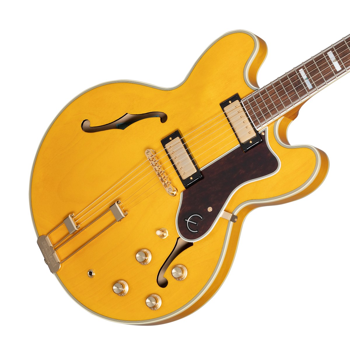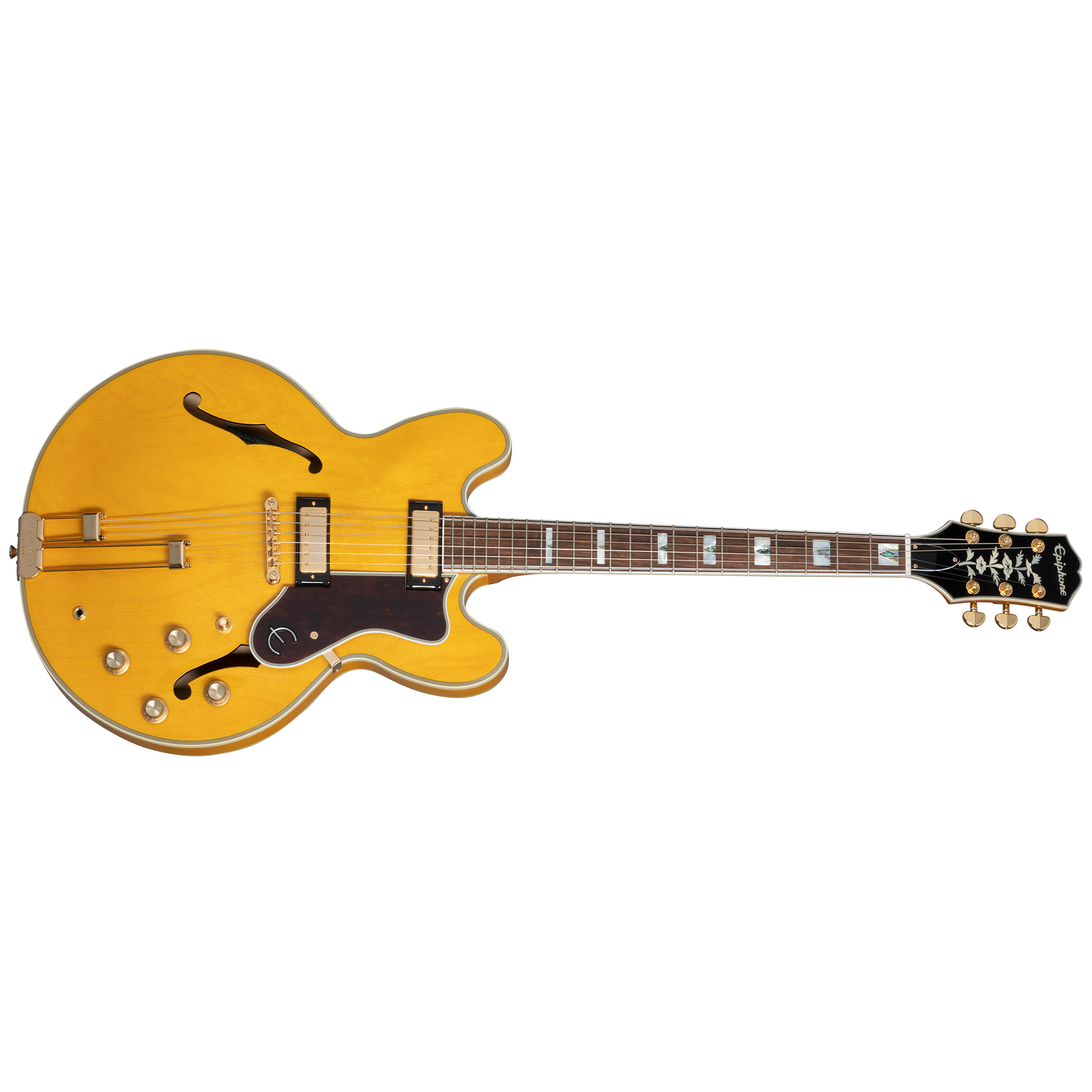 このエレガントな楽器は、レイヤード・メイプルから作られたセミホローボディが採用され、ハウリングに強いメイプルセンターブロックを備えています。22フレット仕様のネックはバインディング仕様で仕上げられ、インディアンローレル指板上ではアバロン素材によるトライアングル・インレイとマザーオブパール素材によるブロック・インレイが施されています。バインディング付きのヘッドストック上では、歴史的なエピフォンのロゴとマザーオブパールのツリーオブライフのデザインが施されています。