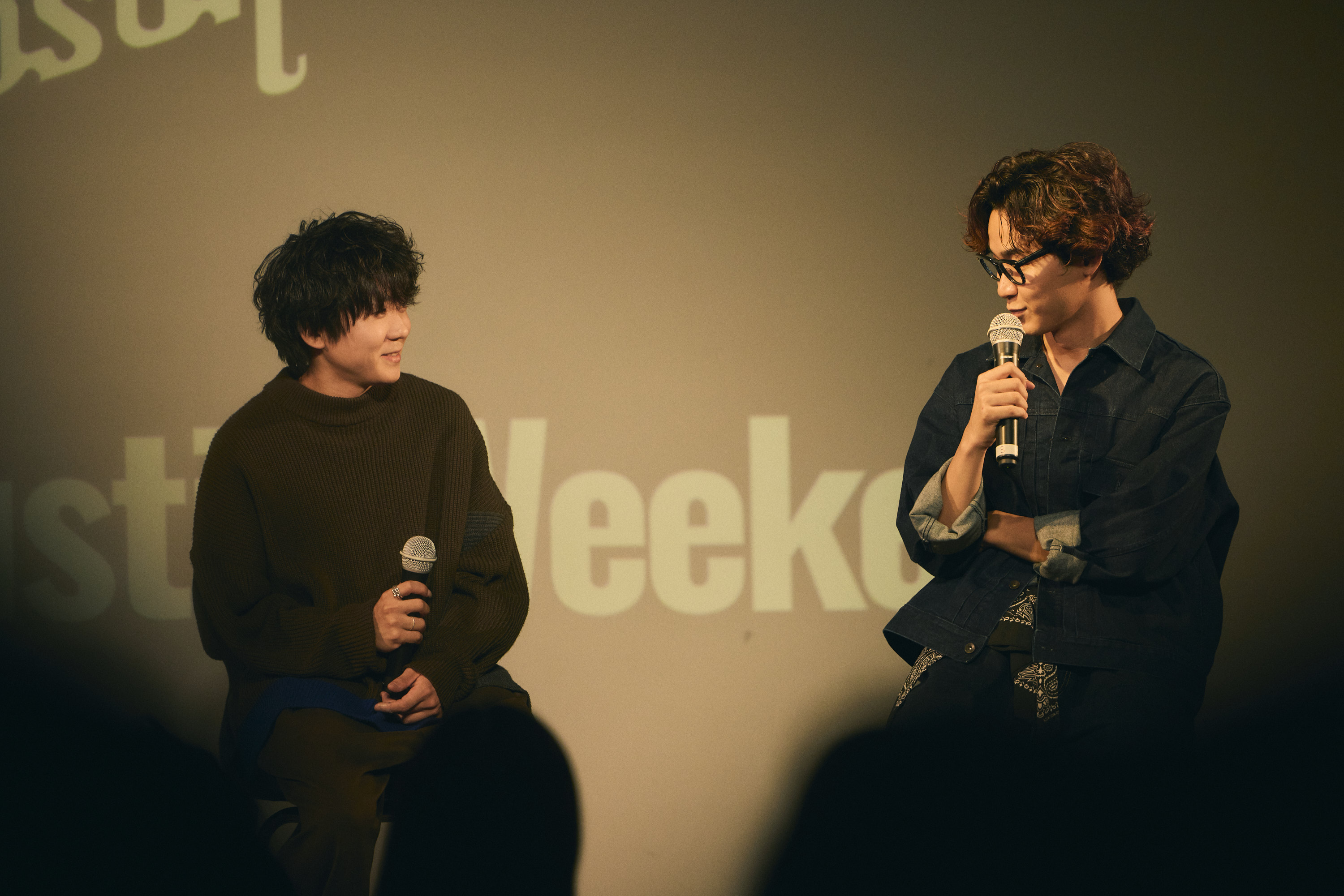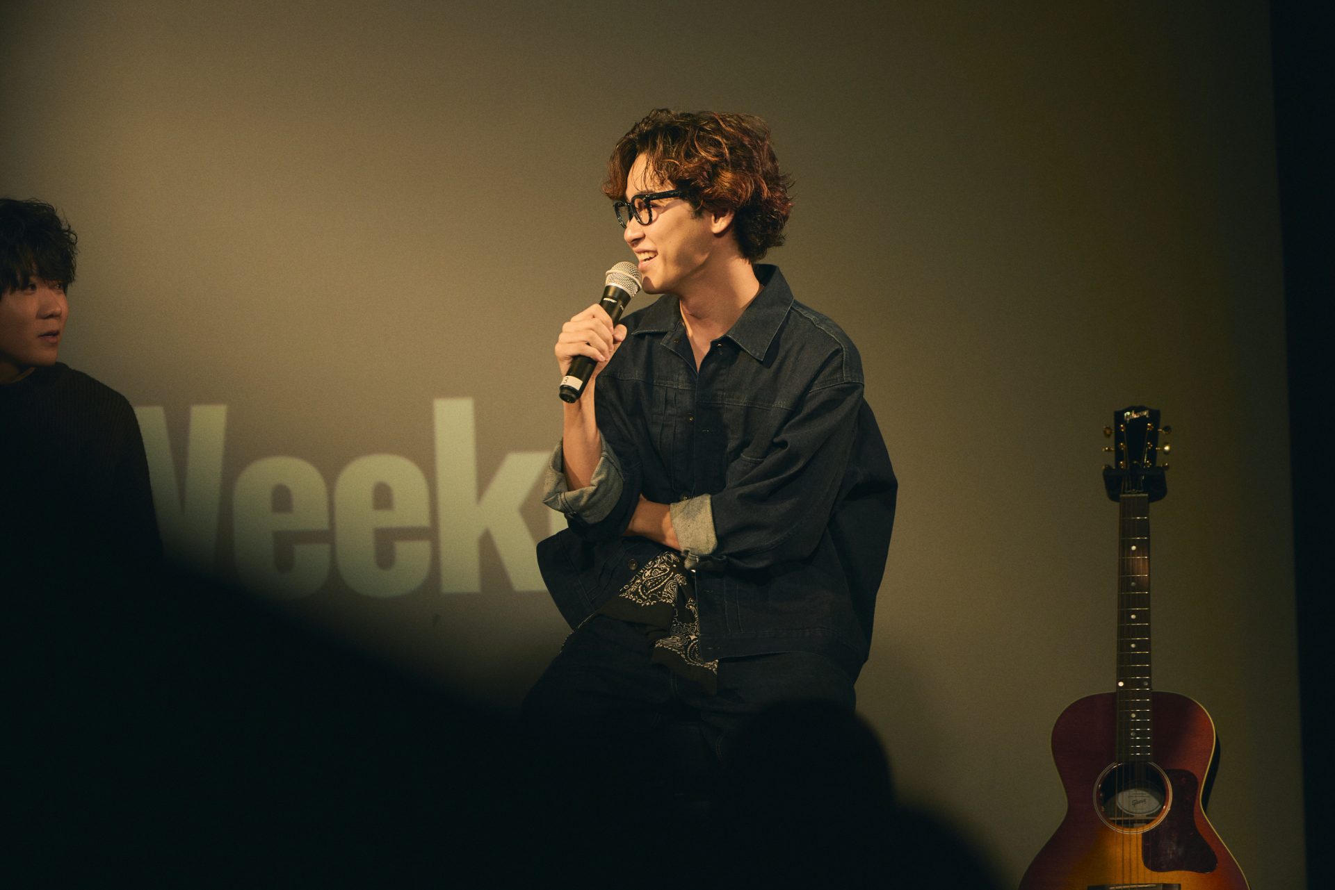 曲作りに関しての話題が及ぶと、ふたりの個性の違いを知ることができた。両名ともギターを相棒に作曲をしているが、上野はコードとメロディが一緒に出てくるほうだといい、“自分の中の言葉を大事にしている。使いたいワードがあれば、1年間自分で使ってから歌詞にしています” と返答。人と会ったりラジオを聴いたりするなどインプットを大切にしているということだ。逆に出てこないときは “心を震わせています……締切で震えてもいるので(笑)” とのこと。森は “日常からバイブスを感じるようにしています。空を見て歌詞が浮かんだり。自分が持っていないものに飛び込んでいく” と答え、プレイからもわかるように、感覚派な面が垣間見られた。