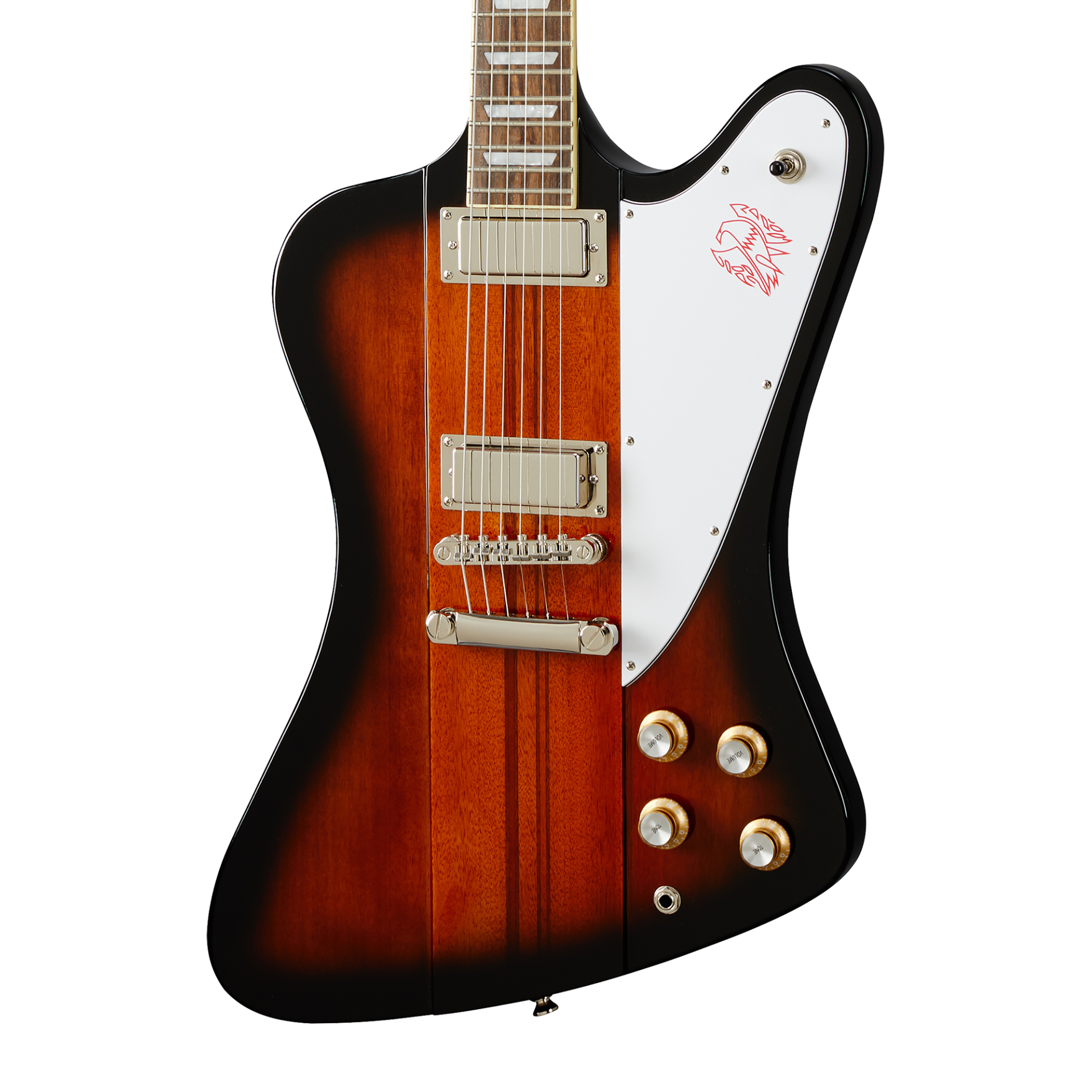ハードウェアには、エピフォンLockTone Tune-O-MaticブリッジとLockToneストップ・バー・テイルピース、Grover Mini Rotomatic 6連チューナーを採用しています。Graph Techナットも装備し、安定したチューニング性能を実現しています。ピックガードには、赤色でホットスタンプされたアイコニックなファイヤーバード・ロゴがあしらわれています。