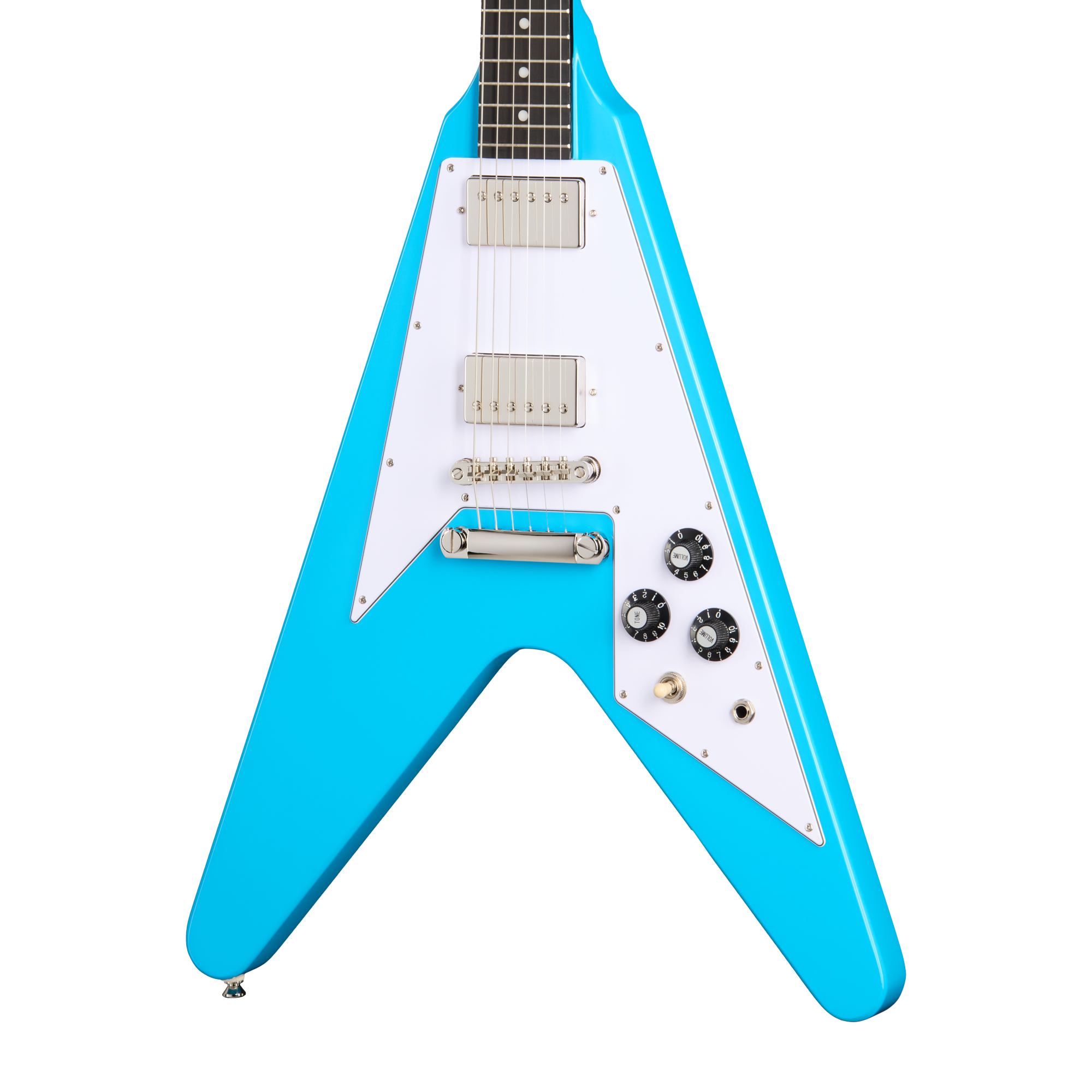 アイコニックなシェイプのマホガニー・ボディには、エピフォンの新開発T-Type PROハムバッカー・ピックアップを搭載しています。これらのピックアップは、当時多くのプレイヤーに支持されたフライング Vならではの太く存在感のあるサウンドと、豊かなサステインを忠実に再現します。コントロールは各ピックアップのボリュームとマスター・トーンで構成され、ウィッチハット・ノブを採用しています。