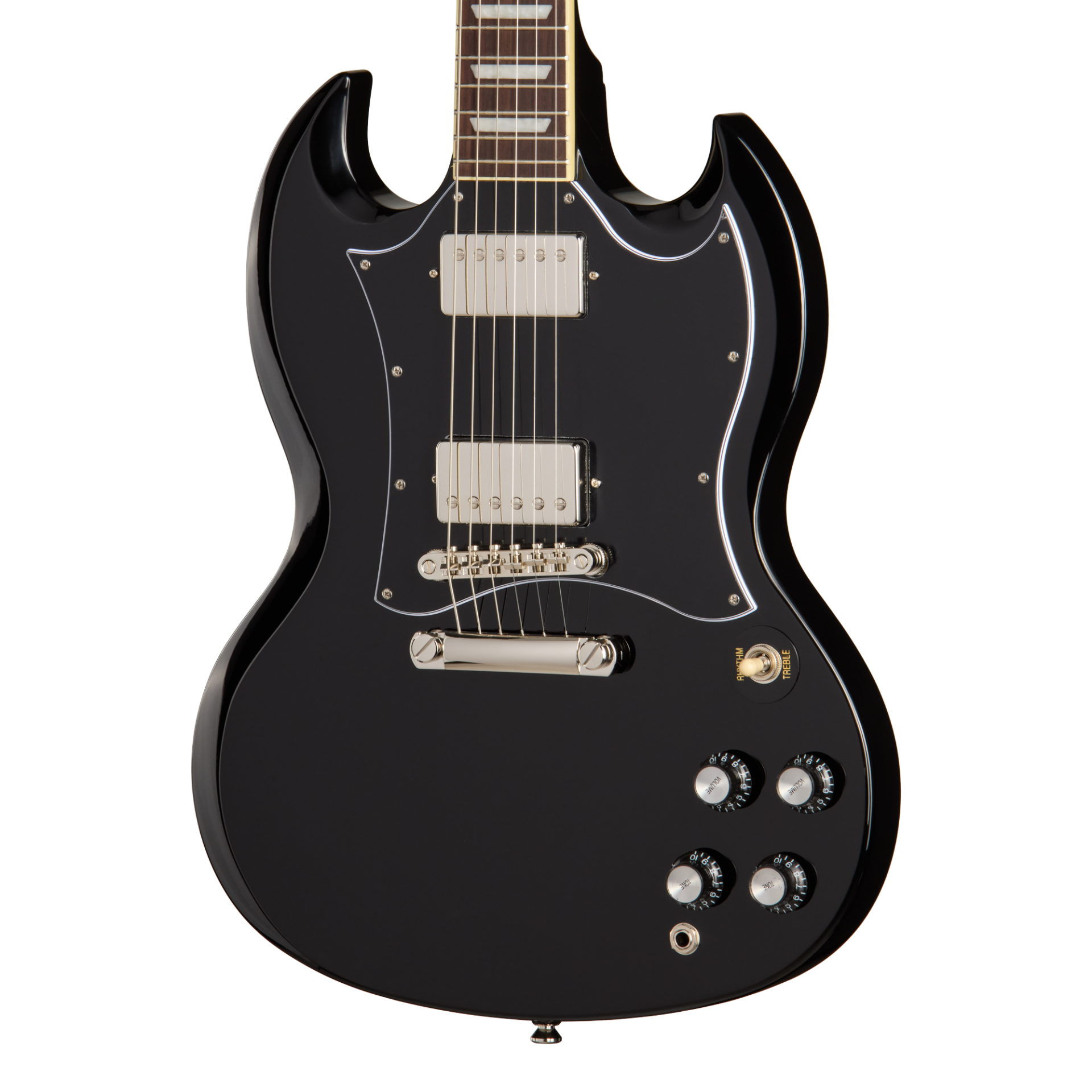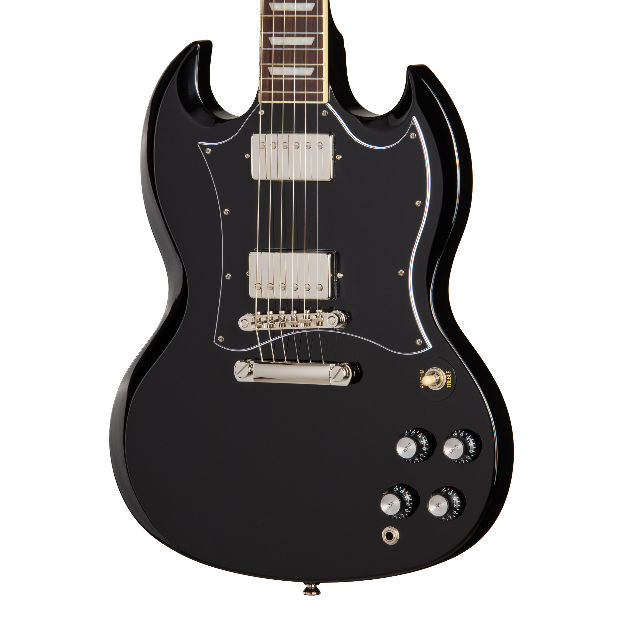 エピフォン SG スタンダードは、22フレットすべてへスムーズにアクセスできる、コンタード加工が施されたダブル・カッタウェイのマホガニー・ボディを採用しています。セットネック構造のマホガニー・ネックは、SGならではの豊かなサステインを実現します。ネックはスリムテーパーCプロファイルを採用し、バインディング付きローズウッド指板には22本のミディアム・ジャンボ・フレットとパーロイド・トラペゾイド・インレイが施されています。12インチRの指板ラディアスにより、ロー・ポジションでのコード演奏がしやすく、チョーキング時にも音詰まりを起こしにくい設計です。