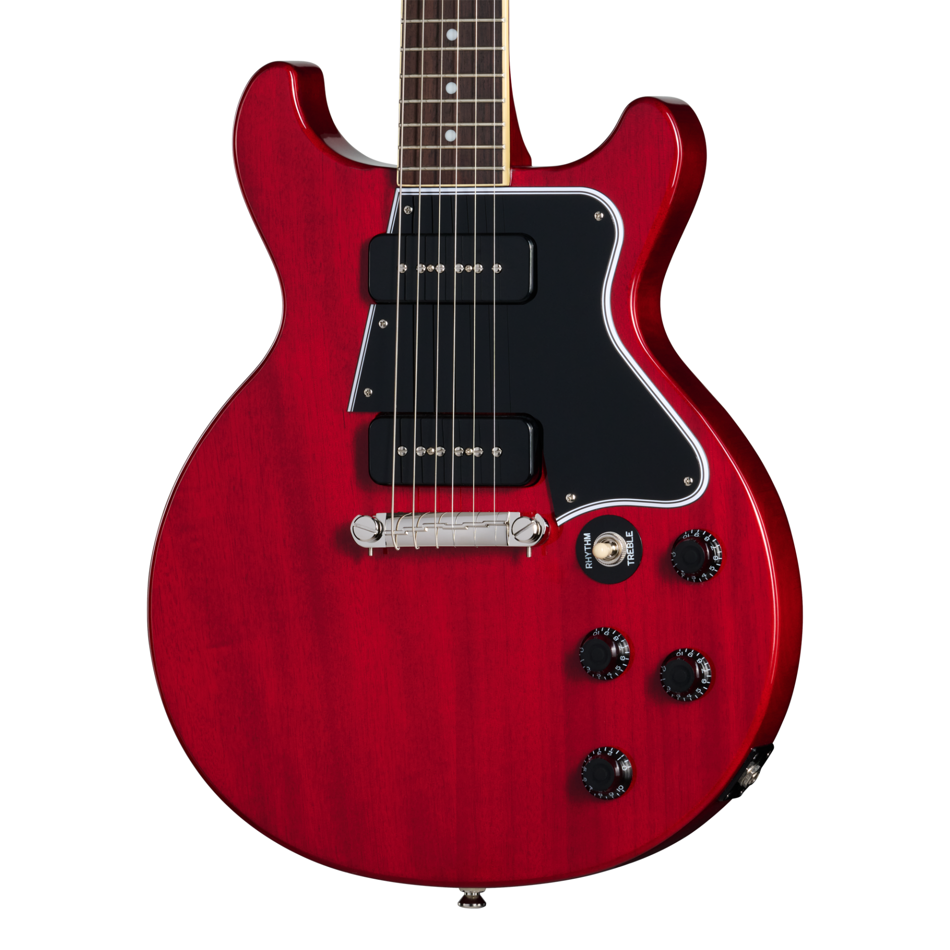 ギブソン レスポール・スペシャルは、レスポール・ジュニアを発展させたモデルとして設計され、ジュニアのシングルP-90ピックアップに対し、2基のP-90ピックアップを搭載することで、より高いサウンドの柔軟性を実現しました。さらに、指板バインディングやマザー・オブ・パールのヘッドストック・ロゴを追加することで、ビジュアル面でも魅力を高め、レスポール・スタンダードとレスポール・ジュニアの中間に位置するモデルとしてラインアップされました。