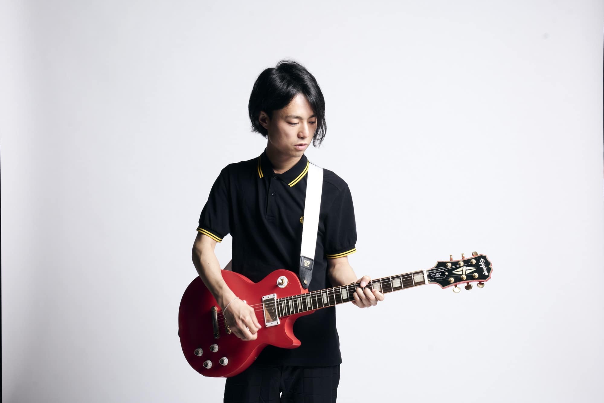 秋山信樹(以下、秋山) 2006年くらい、13歳か14歳のときに初めて買ったエレキがこのLes Paul(レスポール)です。BUMP OF CHICKENが好きで、ボーカル・ギターの藤原基央さんが当時弾いていた、黄色いレスポールに近いモデルを探していたら、よく似た色のエピフォン・レスポール・カスタムと出会いました。これで何曲もつくったし、最初のバンドのライブでもたくさん弾きましたね。
