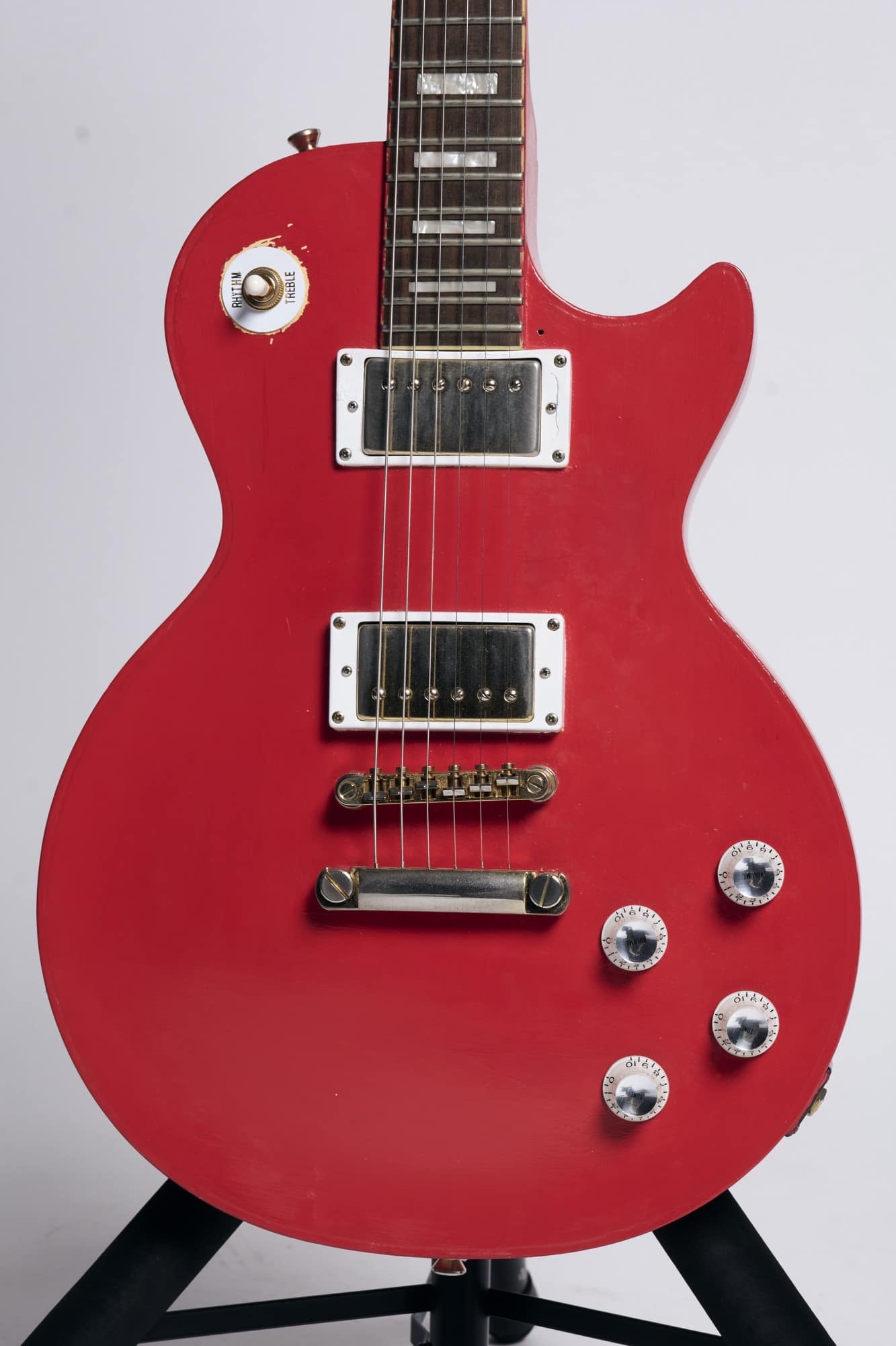 あるとき、ふと思いついてボディを赤色に塗りました。スイッチ類も自分で探したものに換えたりしています。手を加えた分だけ思い入れが深いので、いまだ手放せない大事な1本です。